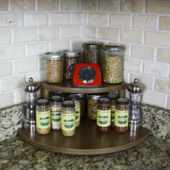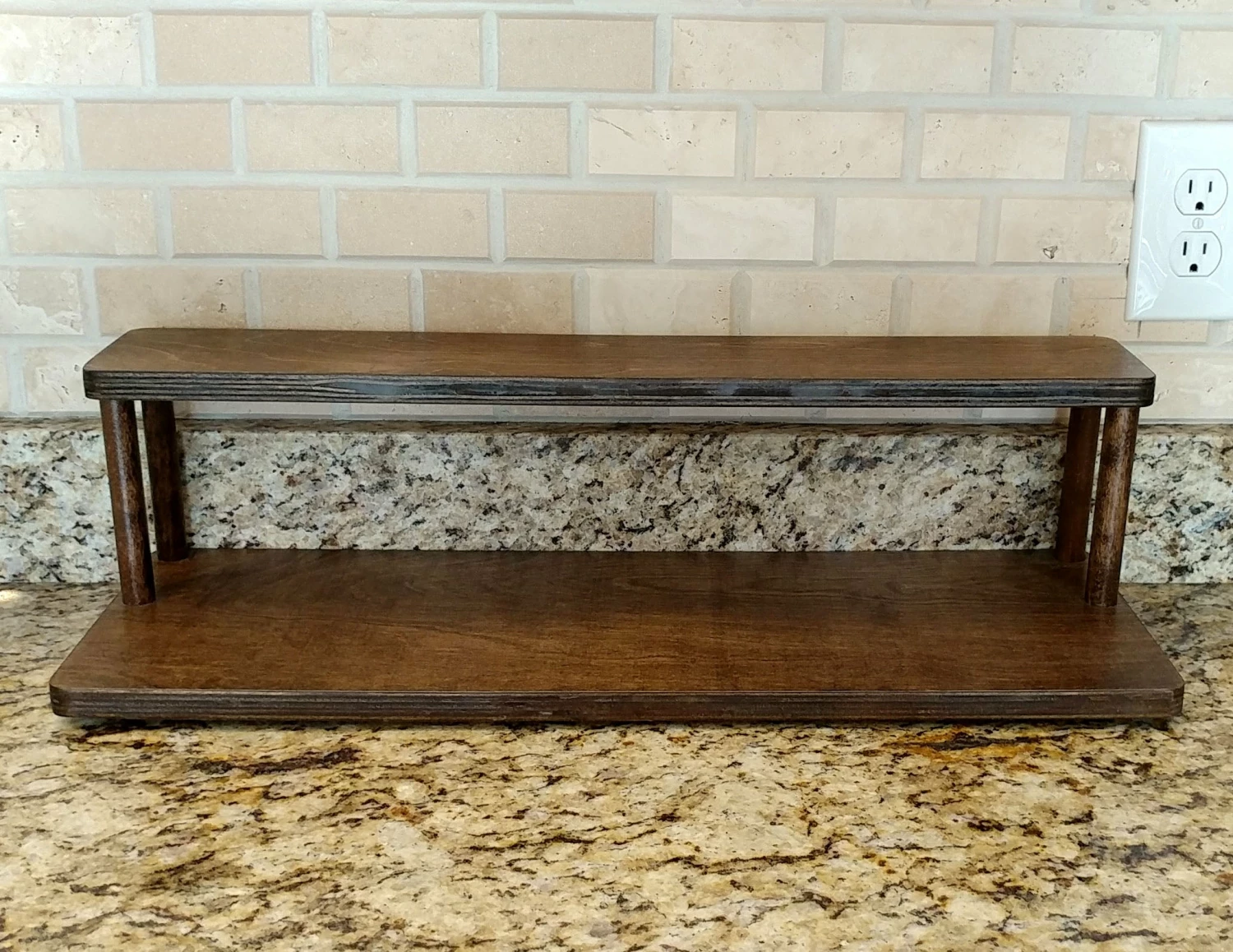 These 2-tier shelves are designed to fit perfectly underneath your kitchen cabinets, while still being able to easily access common spices and ingredients. They are handcrafted in the USA, right here in our very own BPC woodshop. Our counter caddy shelves are constructed from durable baltic birch wood, with 4 secure 5.75″H dowel rods. The stained finish is easy to clean and each shelf is sold with rubber feet on the bottom, giving the bottom shelf a bit of space from your counter to help protect it from scratches and bacteria build-up.