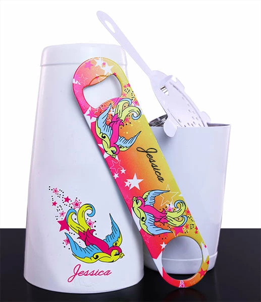 What better gift to give to someone you know who is a bartender or has a home bar than a personalized custom cocktail shaker set. This set comes with a pre-designed background of cute sparrows and all you have to do is fill out the name of the person you’re giving it to and we will handle the rest.