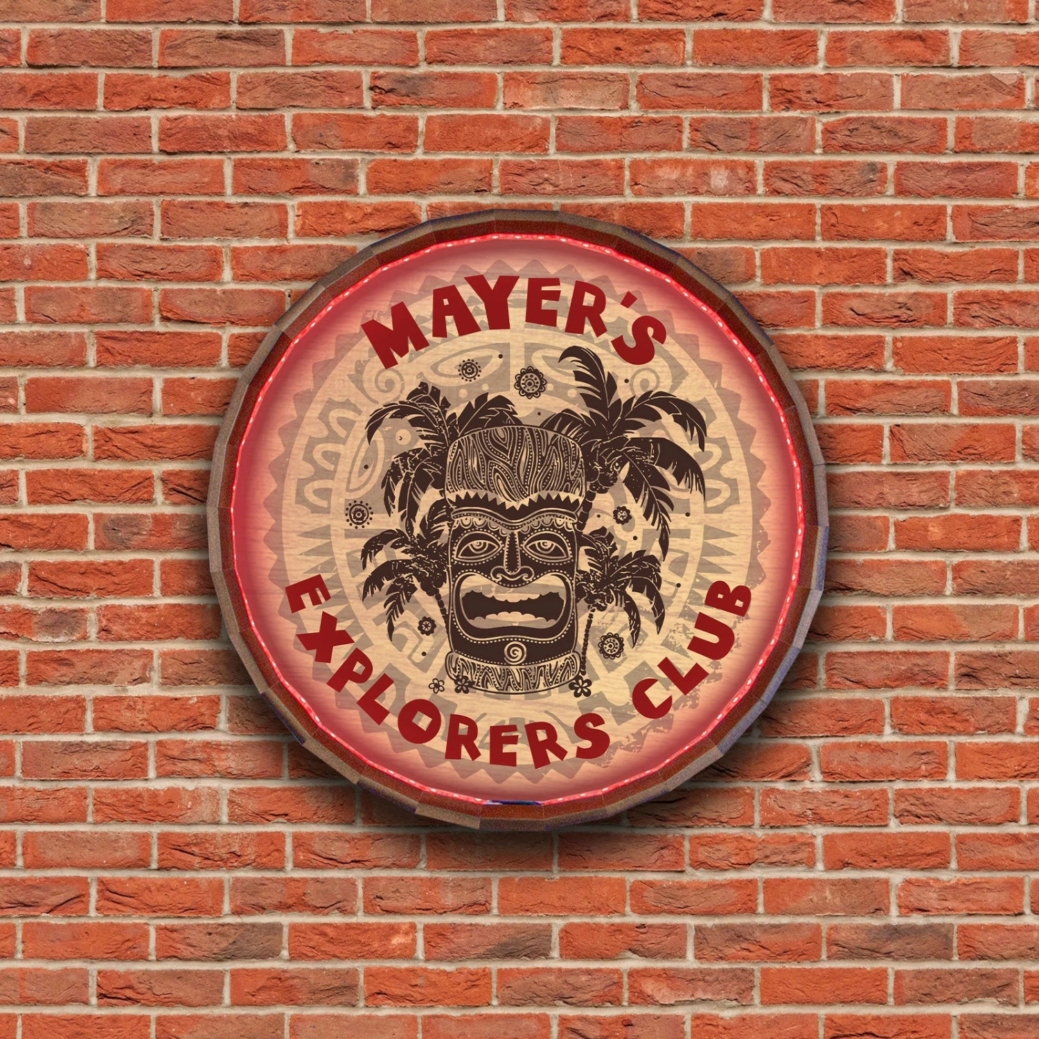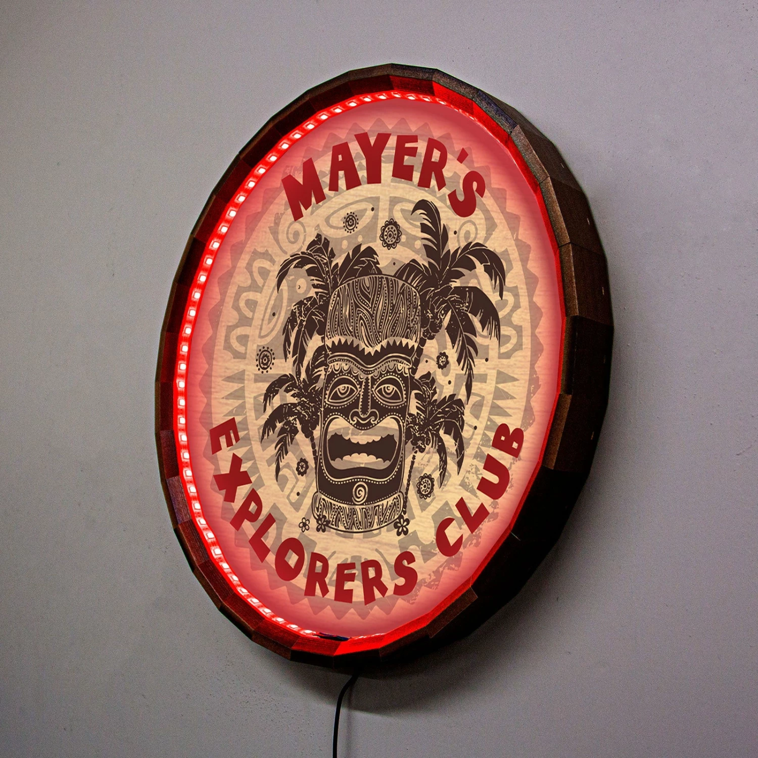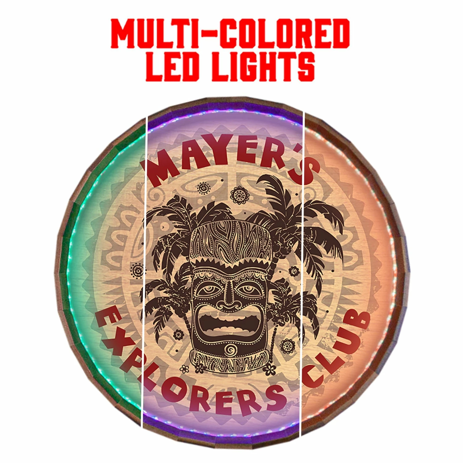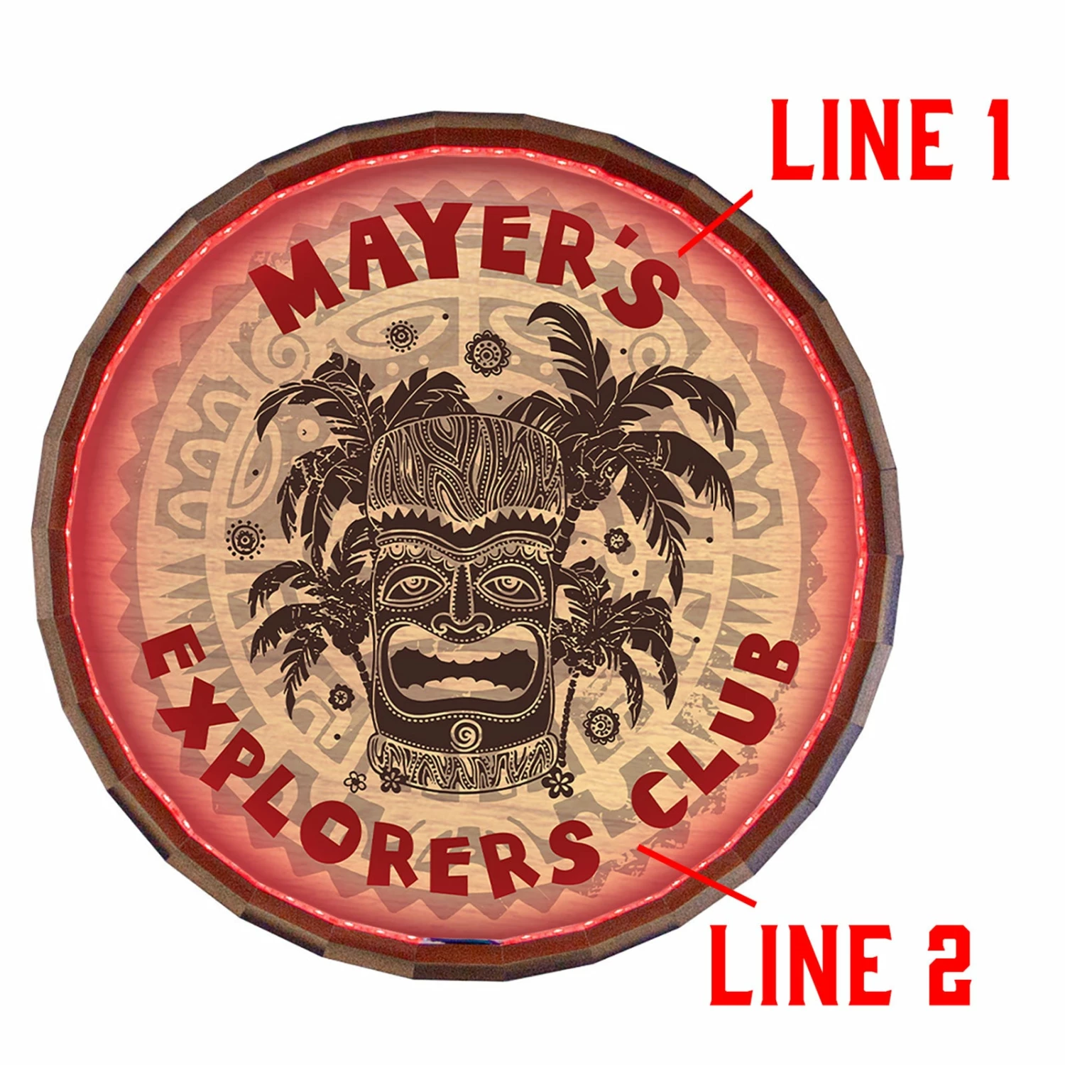 Add a Polynesian look to your tiki bar or man cave with this unique LED Barrel Top Tavern Sign. Any name can be added to this sign at no additional cost. This handmade sign makes a great gift for holidays, birthdays, weddings, and more. Each barrel sign is hand-crafted by skilled artisans, and assembled in the BarProducts.com Wood Shop.