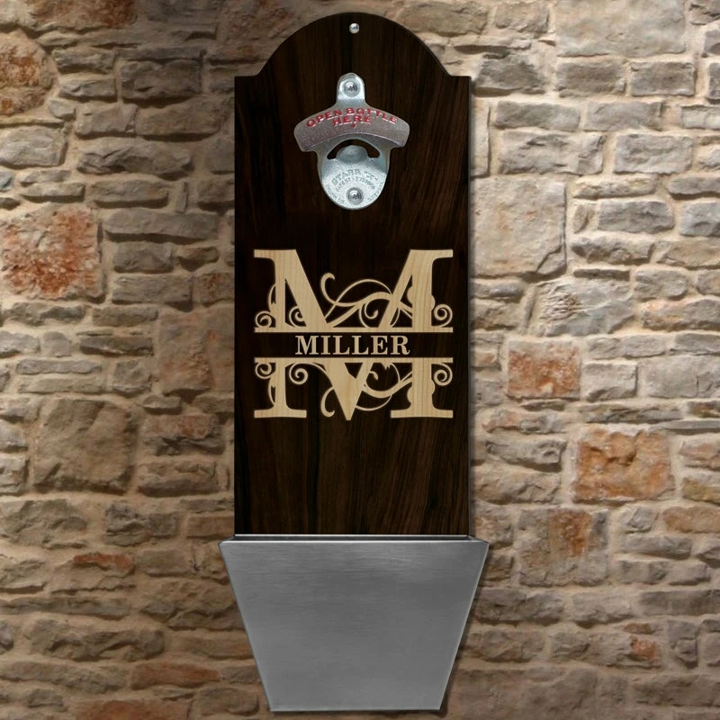 Customize your very own ” Family Monogram” themed wall mounted bottle opener for opening all of your favorite brews! This classic inspired design is perfect for anyone who enjoy a few cold ones with their buddies after a long work week. Any custom text can be added in the “Line 1” area, but we suggest your last name be added to this section. Text will be printed exactly how it is submitted. Choose your main letter, and we do the rest!