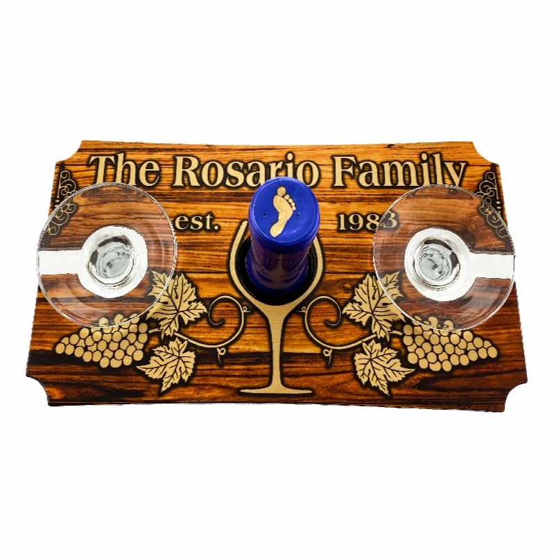 This beautifully rustic wooden Wine Glass Caddy is an exceptional addition to any type of bar or home setting! Our Wine Glass Caddy makes for a wonderful Housewarming gift, Custom Wedding gift, and a unique anniversary gift for the kitchen. The quality craftsmanship (handmade in our Woodshop USA) is beyond compare. This caddy allows you to carry 2 glasses of wine and a bottle of wine all in one hand. It also can be stacked with another caddy to hold 4 glasses! It also comes with 2 of our BARCONIC® 12 OZ WINE GLASSES!