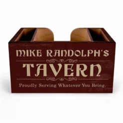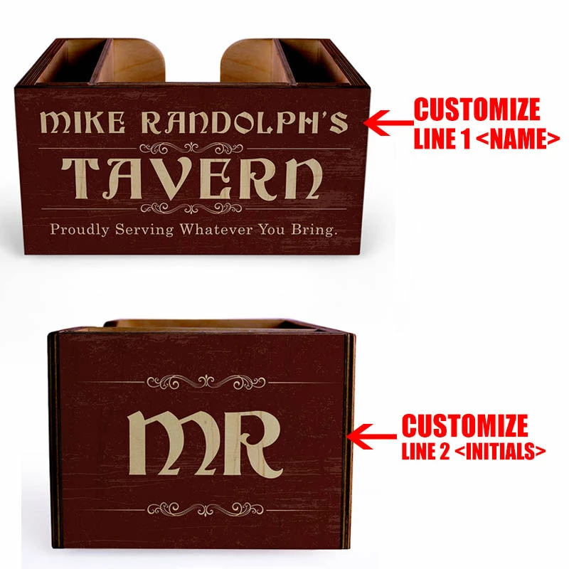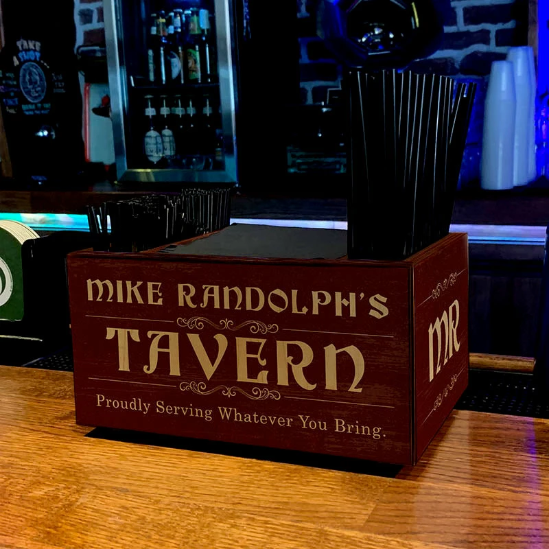 This beautifully rustic wooden Bar Caddy is an exceptional addition to any type of bar setting! The best part? They are easily customized with your very own name and personalization! Simply type in your text, we do the rest! The quality craftsmanship (handmade in the USA) is beyond compare. Designed with 3 compartments perfect for storing your bev naps, straws and stirrers. Durably built with a quality imprint dyed right into the wood maintains a desirable (and trendy) rustic wooden appeal.