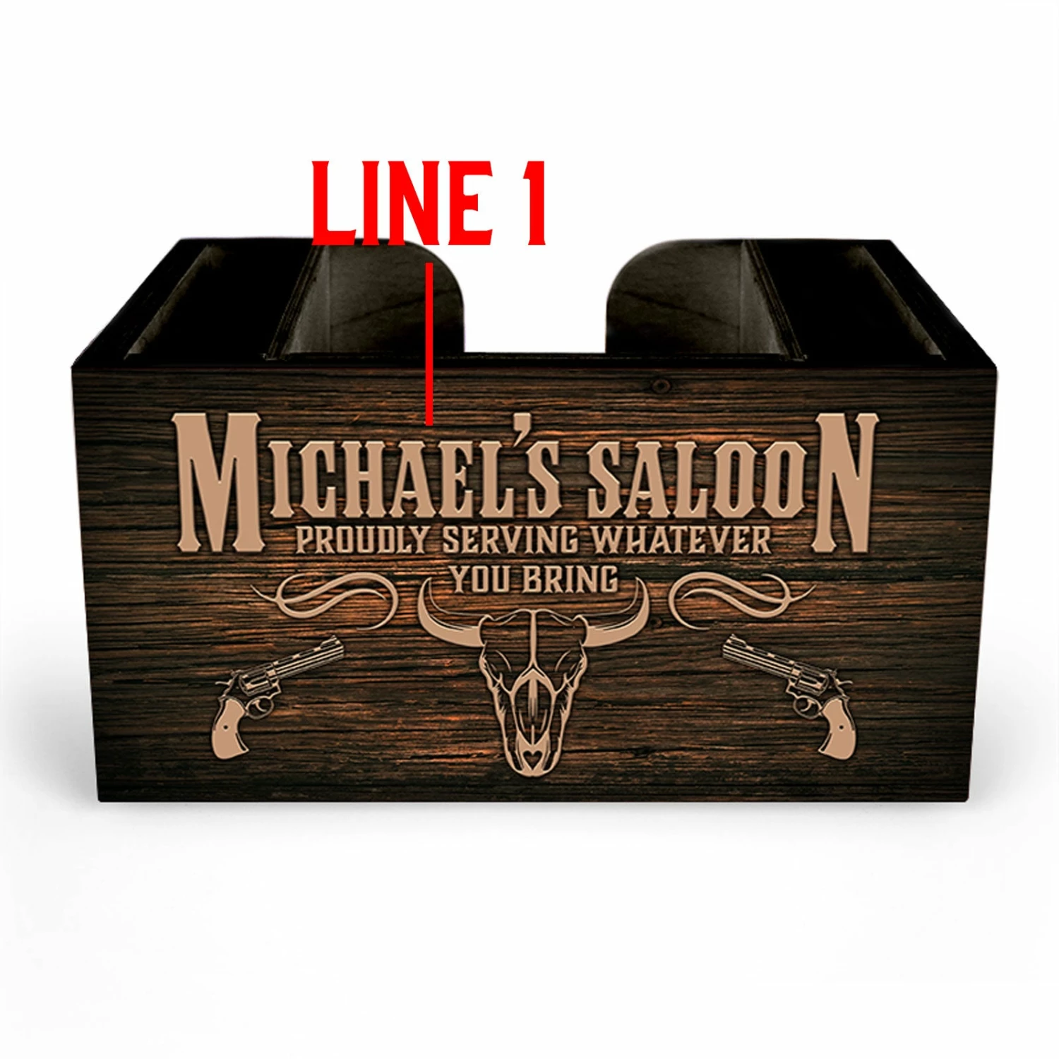 This beautifully rustic wooden Bar Caddy is an exceptional addition to any type of bar setting! The best part? They are easily customized with your very own name and personalization! Simply type in your text, and we do the rest! The quality of craftsmanship (handmade in the USA) is beyond compare. Designed with 3 compartments perfect for storing your bev naps, straws, and stirrers. Durably built with a quality imprint dyed right into the wood maintains a desirable (and trendy) rustic wooden appeal.