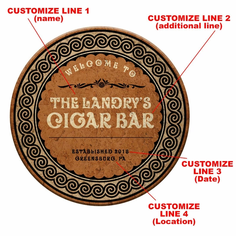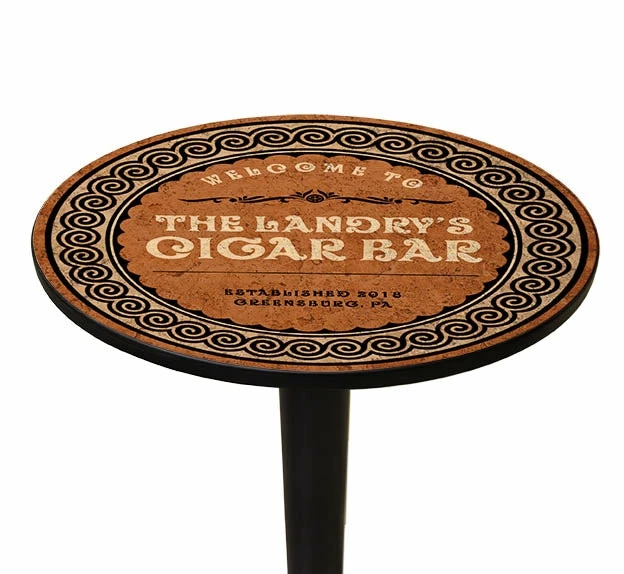 Our personalized, custom designed “Cigar Bar” themed table tops are a beautifully authentic way to decorate your bar or home. The template design showcases a very rustic appeal, and look stunning in any environment… you can even hang it on your wall! Handcrafted in the USA, the solid pine wood makes for a very durable table top option. It is smooth and water resistant, preventing any discoloration or “water rings” that commonly occur with wooden table tops. This makes them more than ideal for any high traffic venue. Table stand and chairs are sold separately.