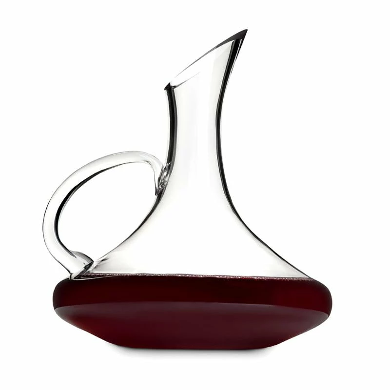 Hand-blown glass that incorporates tilted pour spout, curved handle and broad-set base for optimal aeration through classic design. Holds a standard bottle of wine. Easy filling spout and pouring handle. Hand wash recommended.
