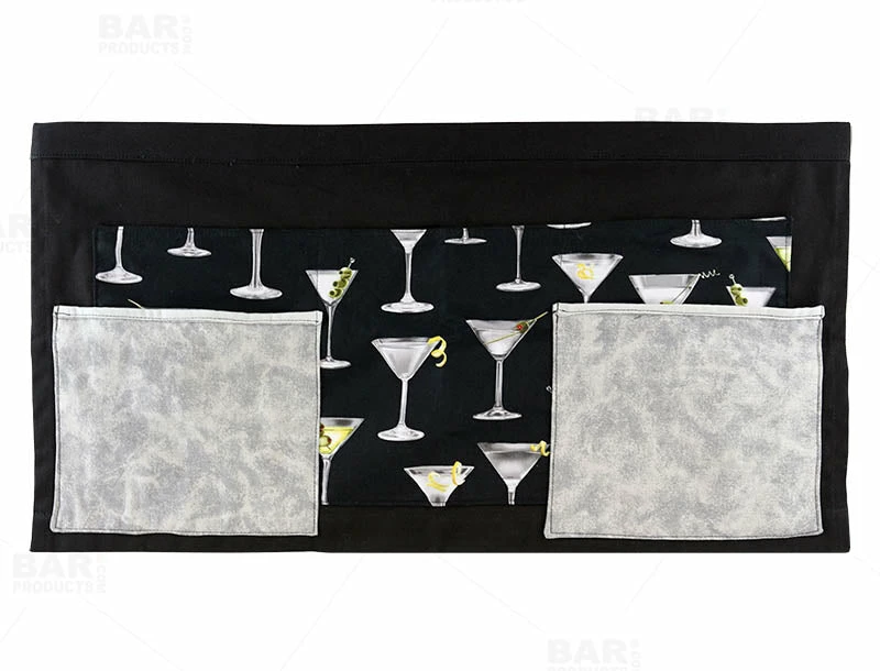 What is not to love about this adorable martini themed apron? Our designer aprons are handcrafted here in the USA and add an undeniably stylish element to your service. Made from 100% cotton, this apron is very durable and extremely high quality. It contains 5 compartments (or pockets) that is suitable for toting and organizing pens, check pads, straws and money during any serving or bartending shift. You are sure to appreciate not only the fashion statement, but also the quality and utility of this martini themed designer apron.