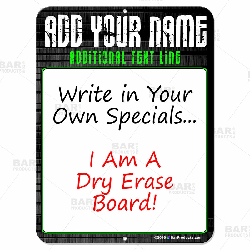 Every bar or restaurant has specials and events they need to promote… it’s what keeps you one step above the competition. There are many ways to get the word out, and this dry erase metal sign is one of the best! This metal “specials” sign is a dry erase board, so you can easily change your specials from day to day or week to week. It wipes away clean with no colored stain left behind. There are 2 small drill holes on the top and bottom, so mounting this sign securely to a wall is easy. Choose from 2 sizes: 12″ x 18″ or 9″ x 12″