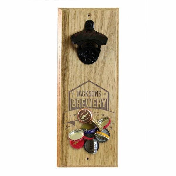 Customize your own Brewery Wooden Wall Bottle Opener with Magnetic Cap Catcher. This unique bottle opener allows you to open beers and not have to worry about where the cap is going to go. The super strong magnet that is attached to the wood catches and holds your bottle caps until you are ready to throw them away. We can customize this beautiful opener with any name or text of your choice! The engraving looks beautiful and makes a great gift for birthdays, weddings, house warming parties, and more! The wood itself is a beautiful heavy duty oak that is even elegant enough to hang in your kitchen.