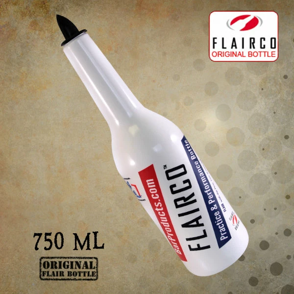 The one and only 750ml Original Flair Bottle has been designed to mimic the weight and feel of glass liquor bottles of the same size, but made from high endurance plastic to allow for years of wear and tear (and missed catches!). We use the full-color Kolorcoat™ process to decorate the Original Flair Bottle with the familiar red, white, and blue Original Flair Bottle graphics. We also offer a 1 Liter version, as both sizes are necessary for aspiring flair bartenders to master.