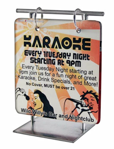 The Flip Menu is a popular new way to display tabletop promotions and menus. Our pre-made two-sided Shooter recipe flip menus are designed specifically to inspire your patrons to try new drinks and increase sales. Flip menus can be customized in full color and are made of virtually indestructible stainless steel, are easy to clean, waterproof and swappable.