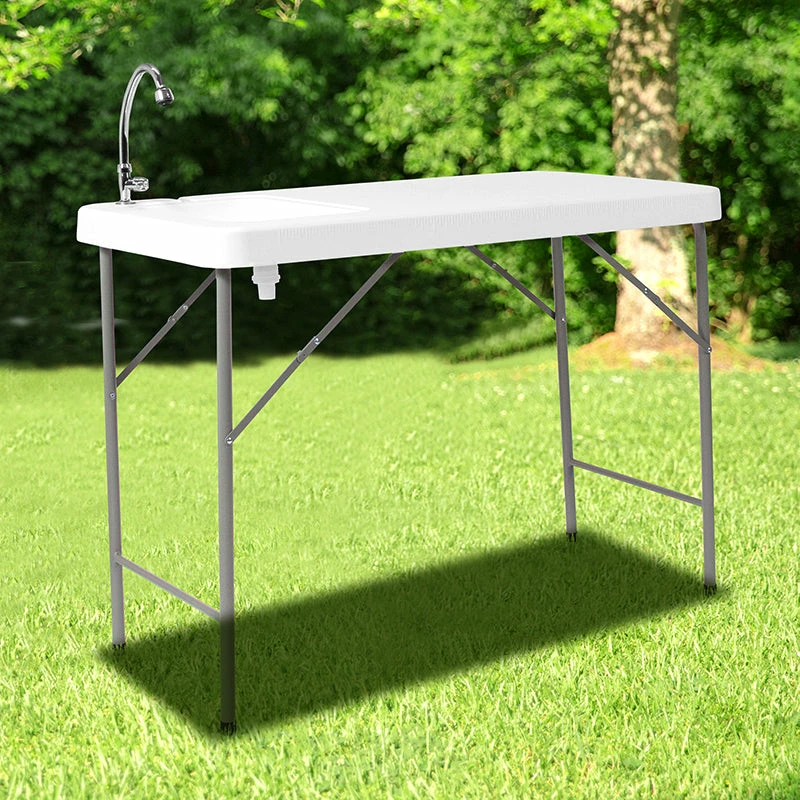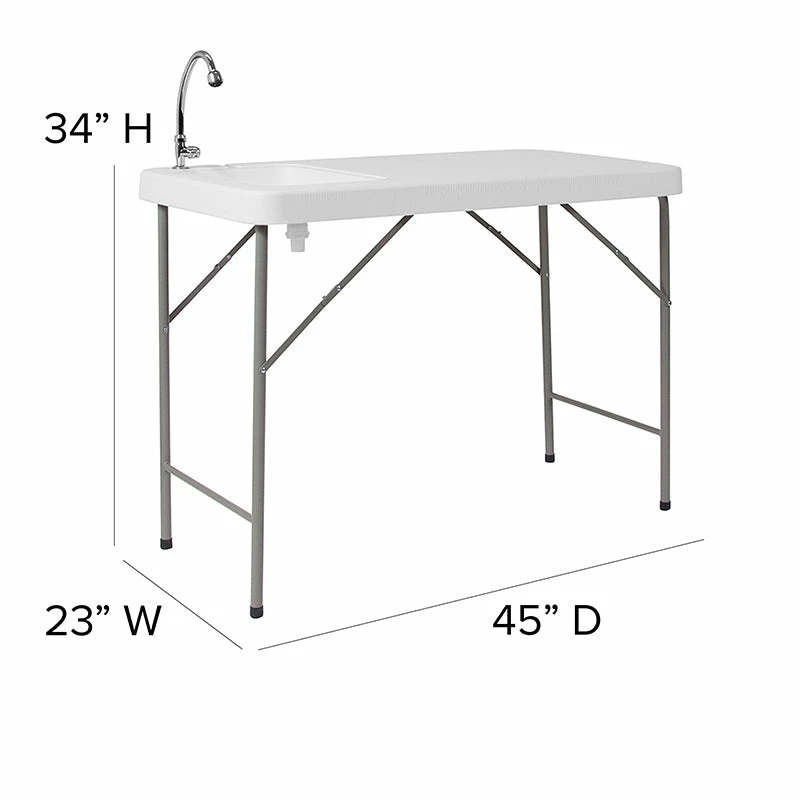 Thick white granite portable table with sink. Includes drain stopper, faucet and faucet attachments. Ideal for camping, canning vegetables and fruits or outdoor events. Sink measures 11.50″W x 16.25″L x 3″H. Table measures 23″ W x 45″ L x 34″ H and table top thickness is 3″.