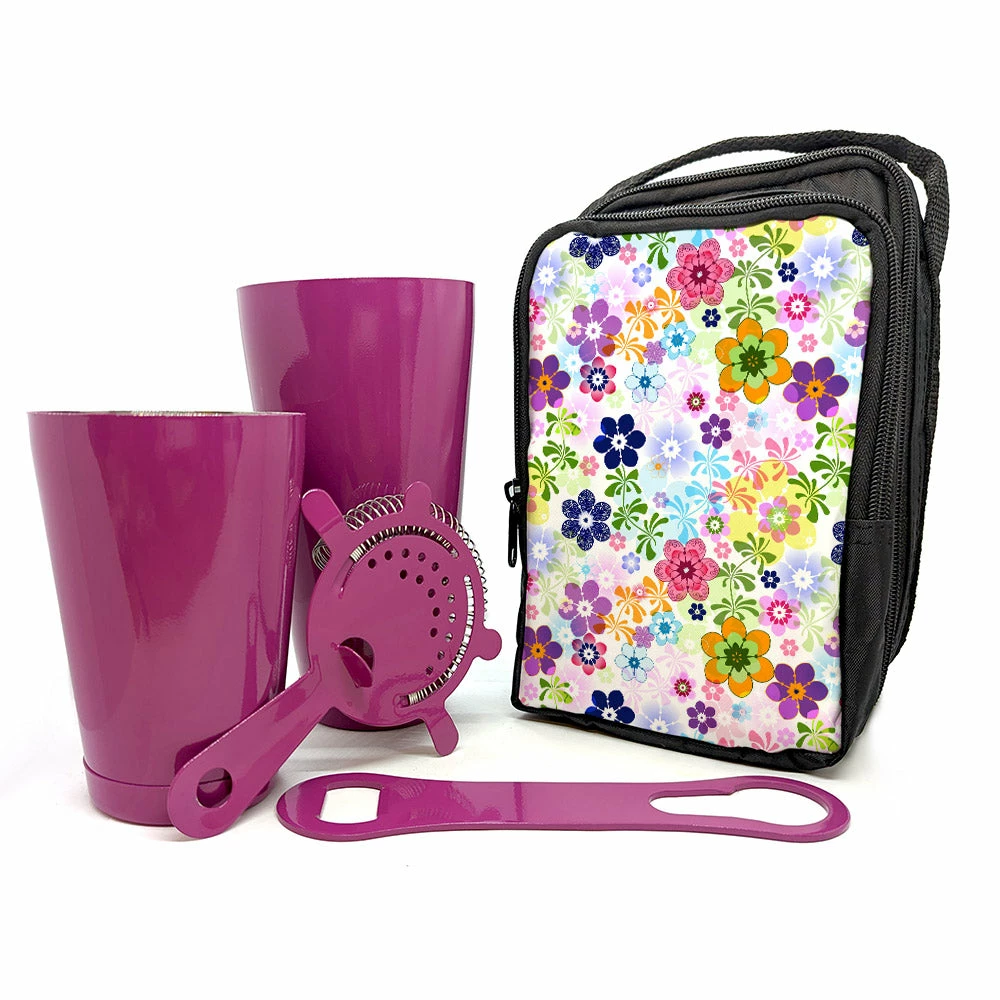 This Fun Floral Bar Tote Set is the perfect companion for hosting any get together or toting your bar tools from shift to shift! It comes with all the tools you need to get the job down in style. Shake, strain, and open bottles with flare using this chic purple bar tool set and matching fun floral print bar tote. The Bar tote has plenty of room to accommodate not only the 4 piece bar set but also any additional bar tools you may require such as jiggers, muddlers, bar spoons and more! Our bar tote sets also make for the perfect gift to the bartender in your life.