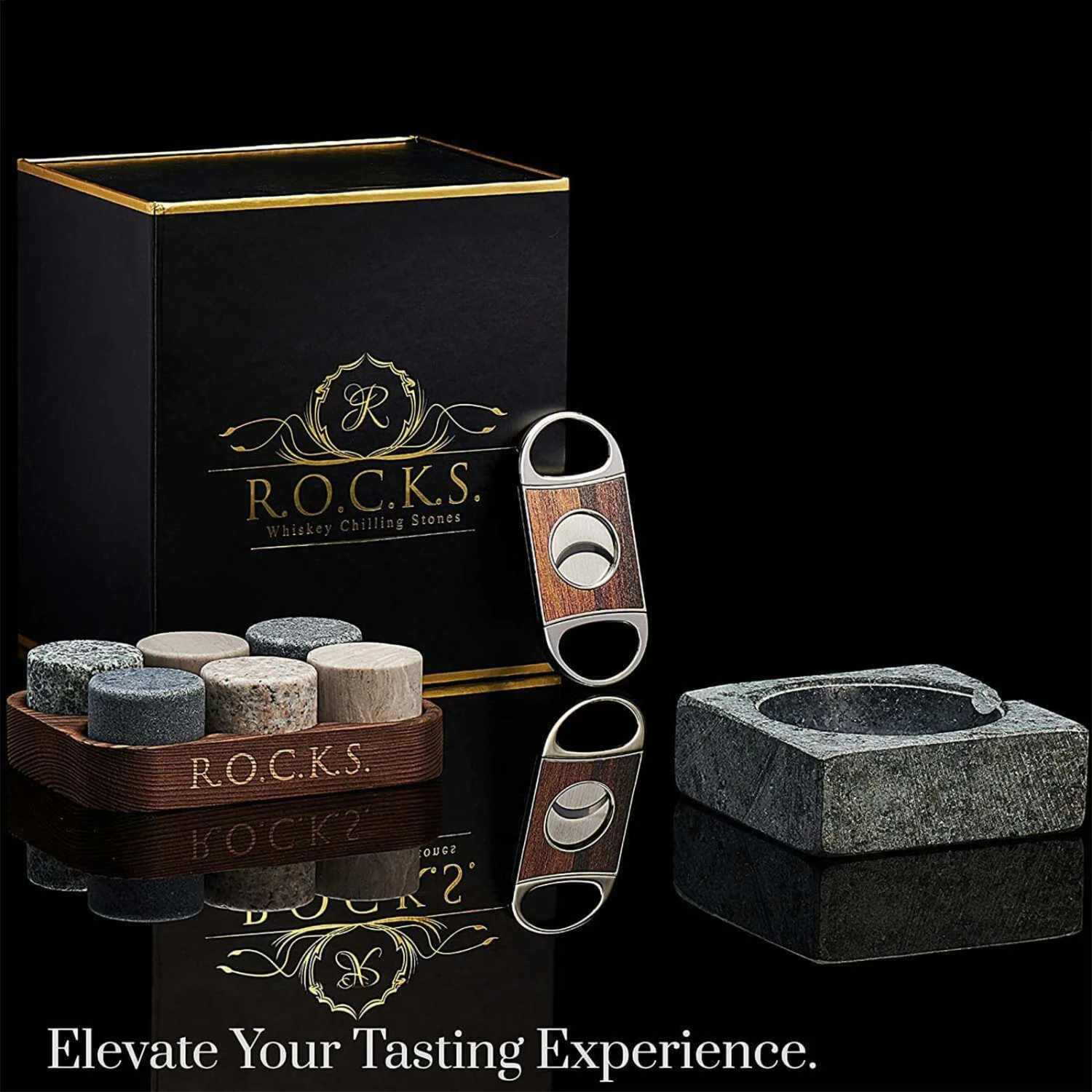 ROCKS whiskey stones with our custom cigar cutter (0.94”, up to 60 ring gauge) and a minimalist heavy granite stone cigar ashtray. Cigars make excellent pairs to most spirits, such as Scotch Whiskey and Cognac, while cocktails featuring these are also great choices. The round whiskey stones cool your drink without the dilution found from traditional melting ice cubes which alters the true taste of spirits. Meticulously handcrafted, the minimalist and solid granite cigar ashtray is distinctive, unexpected and rare. Combining the best in whiskey tasting with cigar smoking experiences. This collection is to be kept a lifetime.