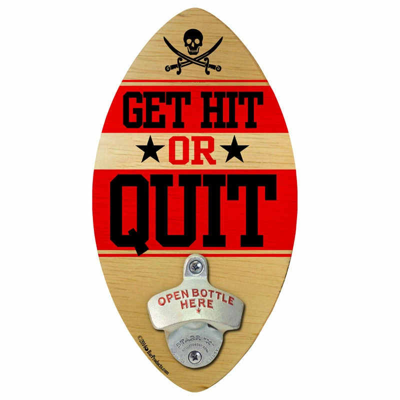 Quitting is the hardest habit to break, the best way to avoid it is simple, don’t start! There’s no crying in baseball and no quitting in football! This “Get Hit or Quit” wall mounted bottle opener is the perfect gift for those who take football as serious as we do. This hand-crafted wall-mounted football-shaped plaque is a great addition to any bar, sports pub or man cave! This will also add some motivation to anyone’s day, giving them that extra encouragement every time they crack open a brew! The bottle opener on this piece, made from durable cast iron, has no quit in it and is guaranteed to last.