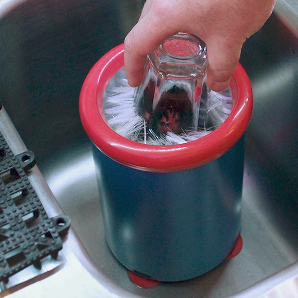 This Self Contained Glass Washer is a “single action” glass washer that can be used anywhere! It is designed to get your glassware completely clean with just one swift motion! The strong yet gentle bristles on this glass cleaner will have your glasses sparkling, and since the water is self contained inside it, you can use it in a bar or even at home. The 4 rubber suction cup feet hold this remarkably efficient and space saving washer in place. Measures 8 inches tall x 6 inches wide.