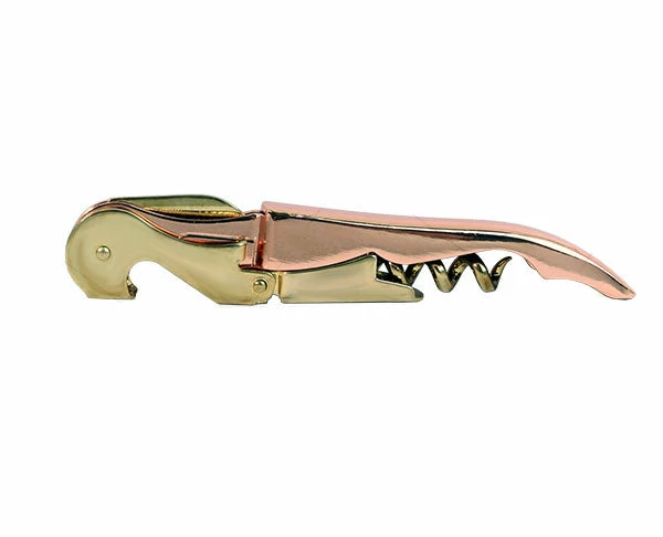 This double-lever corkscrew boasts a gold plated boot lever, screw and foil cutter as well as a copper plated handle. The double hinged lever allows for effortless cork removal from any bottle. This opener is durable and long lasting made with stainless steel and plated in copper and gold for added elegance and class. The design is sleek and streamline for easy storage and handling. This particular corkscrew also provides a variety of functions; not only is its main purpose to open wine bottles but it also includes a foil cutter and has the ability to open beer bottles. Also known as a waiter’s corkscrew, that tool may be small but it is essential to bartenders and waiters in any club or bar setting.