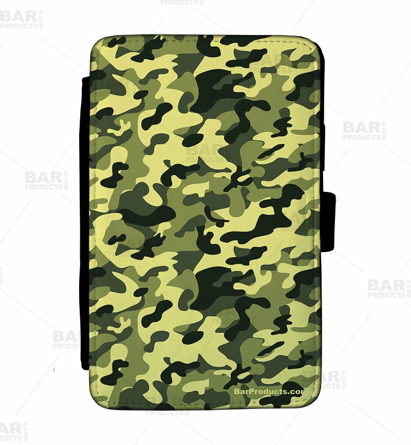 When not in use, the snap button will keep your check pad holder closed and your inner contents safe. Slip it into your apron, or utilize the built in belt clip to fasten to your pants or belt for quick and easy access. Constructed from a leather and polyester material combination, the face of this guest check pad holder showcases a full color camouflage design that is perfect for adding a bit of personality to your service.