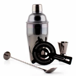 This stainless steel Gun Metal Barware Set includes everything you need to get started in making cocktails. Complete with a cobbler style shaker, double jigger, hawthorne strainer, and spoon that doubles as a muddler. The metallic finish creates a unique looking set of bar tools than your usual silver finish. This item is great to give as a gift to bartenders or cocktail lovers in your life.
