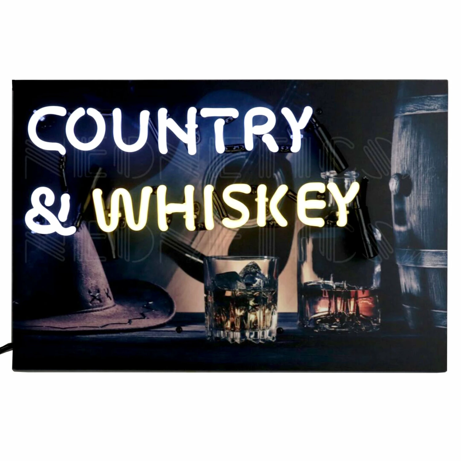 The white and yellow letters of the hand blown neon words COUNTRY & WHISKEY are backed by a beautiful image of an acoustic guitar, old cowboy hat, whiskey barrel, and bottle with a glass of smooth amber whiskey. This neon sign will add color and warmth to your music room, bar, basement or man cave. Our junior sized neon sign hangs right on the wall with no surrounding metal bracket and looks great on or off!