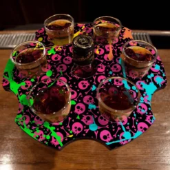 6-Shooter Wood Shot Glass Caddy Tray And Bottle Topper – “Skulls And Splats”