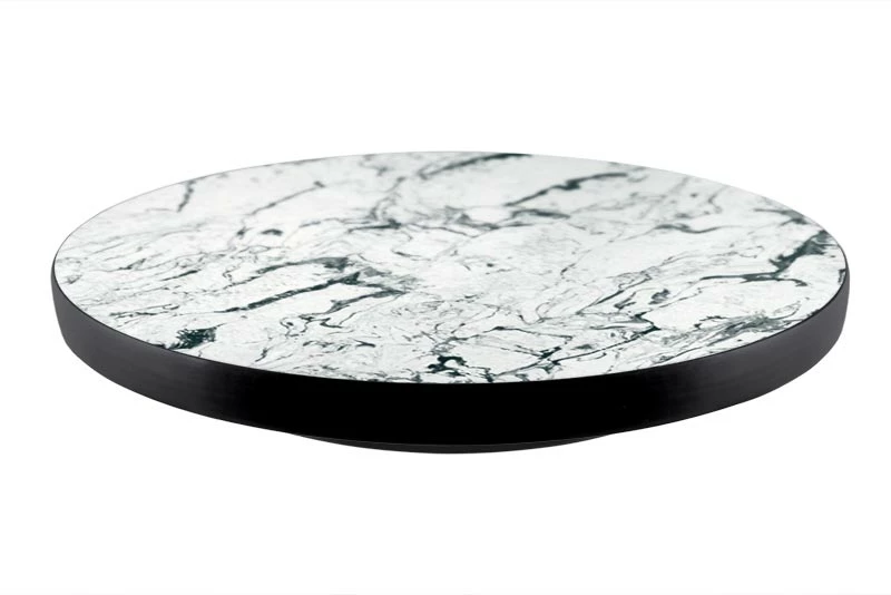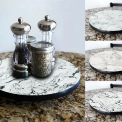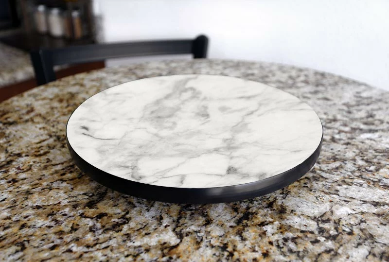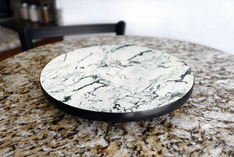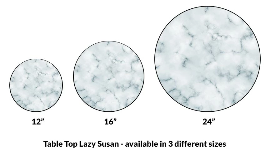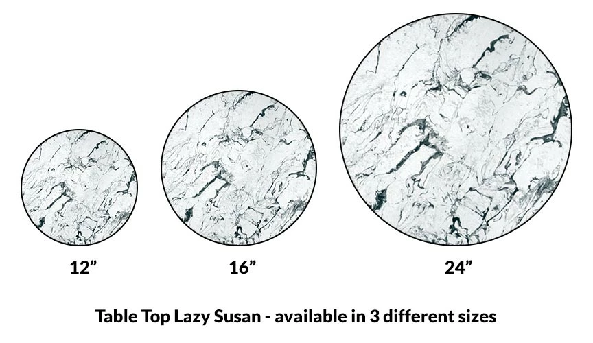 We offer three different marble designs for these table top Lazy Susans. Each full color design, designed to mimic real counter top marble, is carefully applied using our unique Kolorcoat™ process that allows the vibrant colors to shine through.