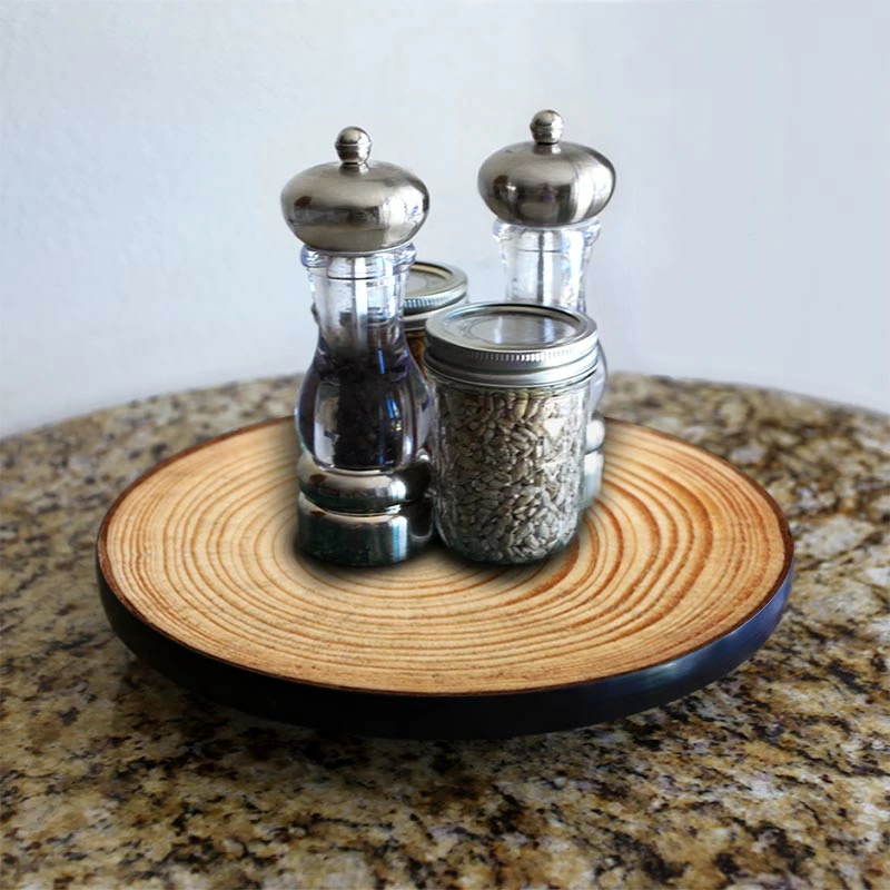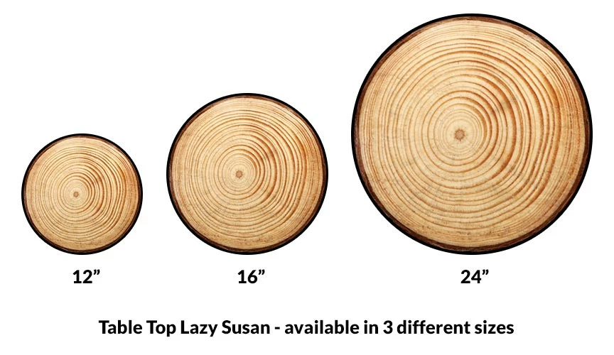 These beautiful Lazy Susans are 3/4″ thick, and come in three different sizes, 12″, 16″, and 24″, meaning there’s a size available for any table or counter space. The round base is sturdy, and the spinning mechanism is well-built and allows for smooth, easy spinning, and featured 4 rubber stoppers that protect your table top from wood scraping. The Lazy Susan is wrapped with rubber black T-molding that protects the side of the all-natural wood top.