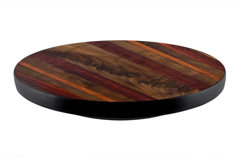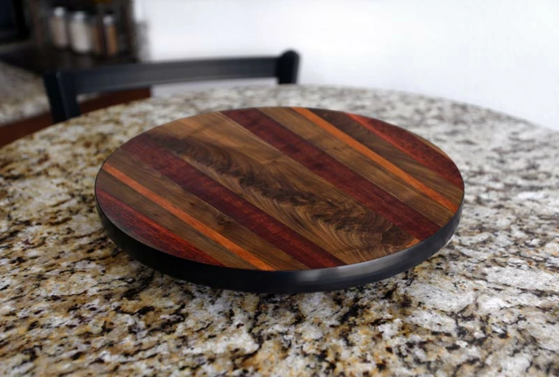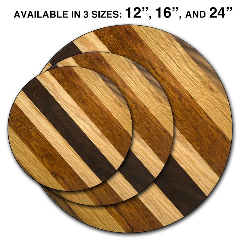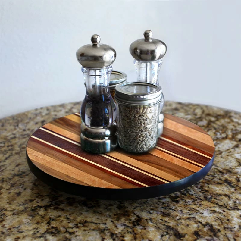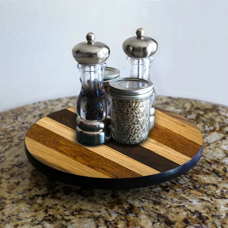 These beautiful Lazy Susans are 3/4″ thick, and come in three different sizes, 12″, 16″, and 24″, meaning there’s a size available for any table or counter space. The round base is sturdy, and the spinning mechanism is well-built and allows for smooth, easy spinning, and featured 4 rubber stoppers that protect your table top from wood scraping. The Lazy Susan is wrapped with rubber black T-molding that protects the side of the all-natural wood top.