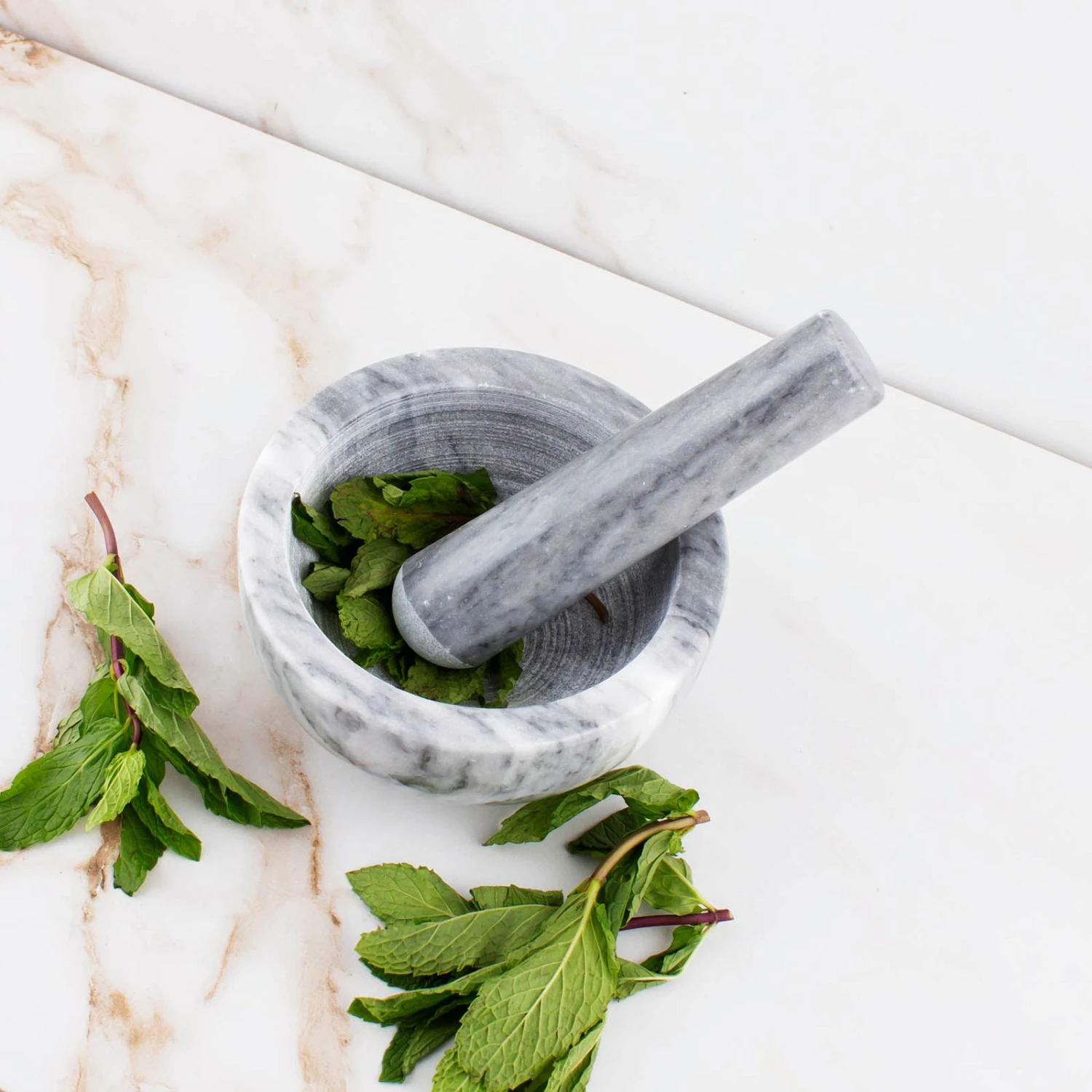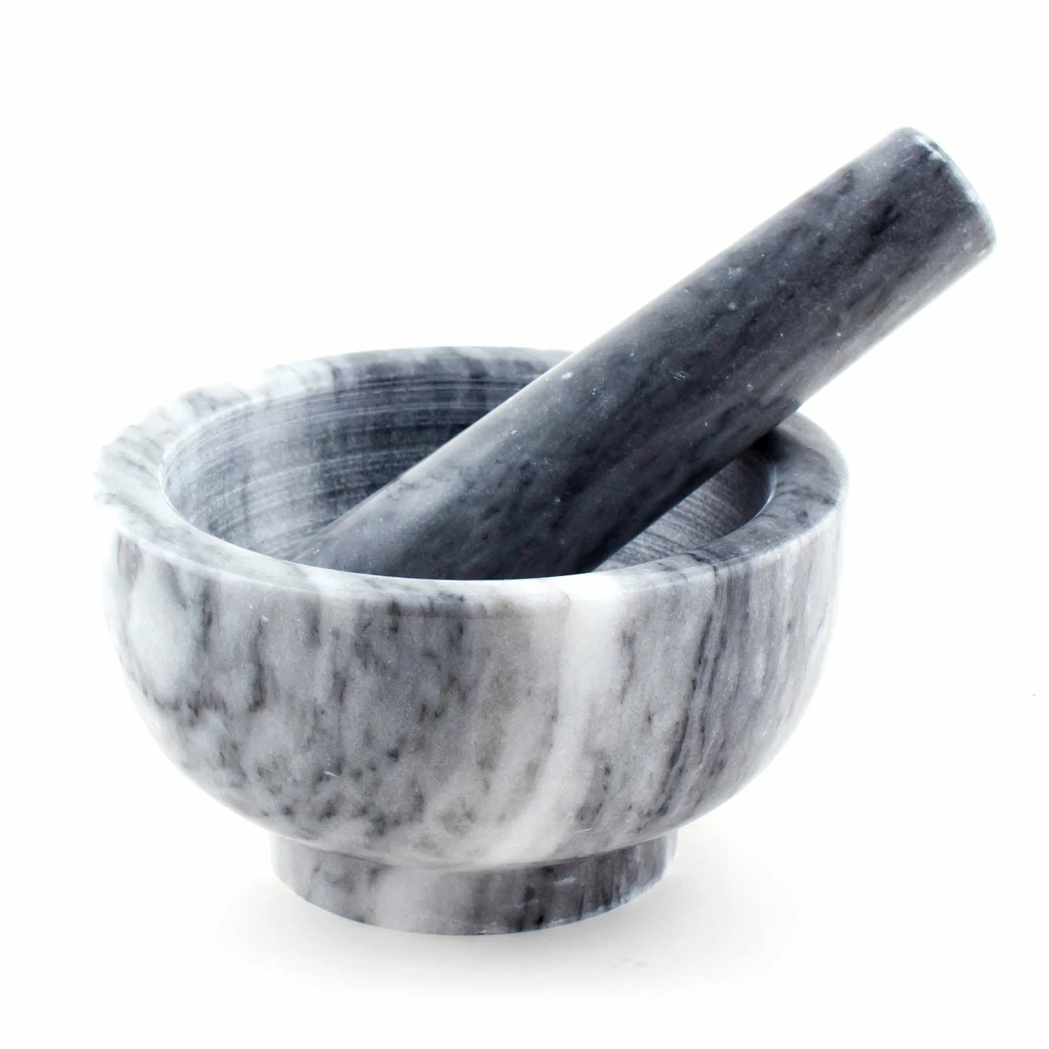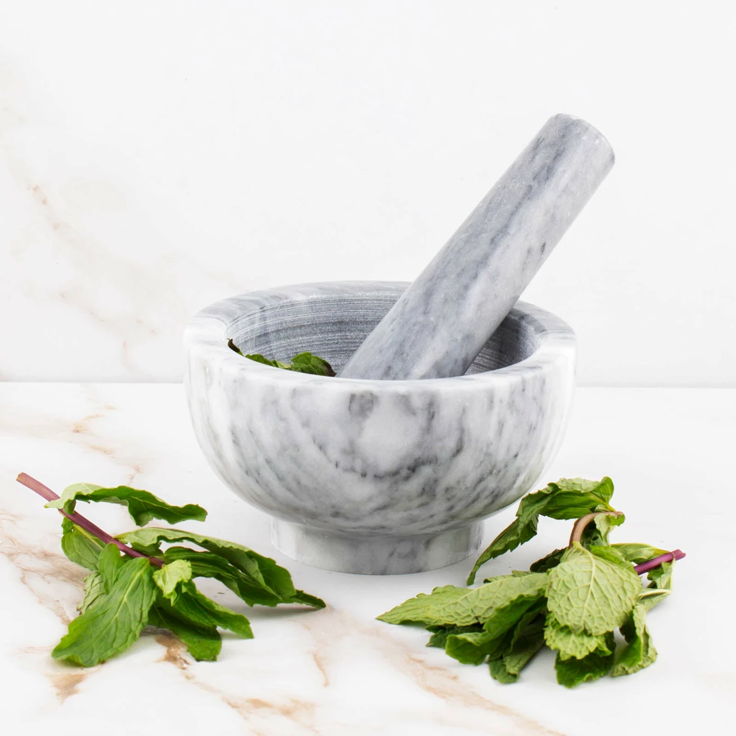 Perfectly grind up your favorite herbs and spices with this marble mortar & pastel set. Crushing and grinding fresh leaves and stems releases flavors and fragrances for you to fully enjoy. Each mortar set is cut from a solid piece of white marble allowing it to be very durable.
