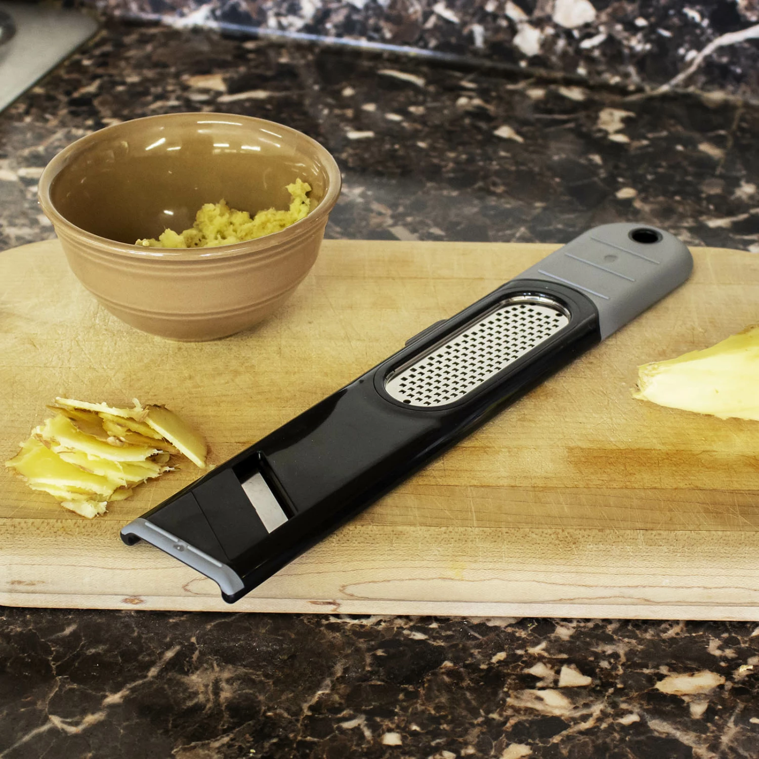 Enjoy fresh ginger without making peeling, slicing, and grating ginger a chore. This Microplane 3-in-1 Ginger Tool simplifies the task of prepping ginger! It has a non-slip base and the handle allows for comfort and stability. You can hold it at an angle, or you can place it flat on a surface to slice or grate. The blades are made of stainless steel and are dishwasher safe.