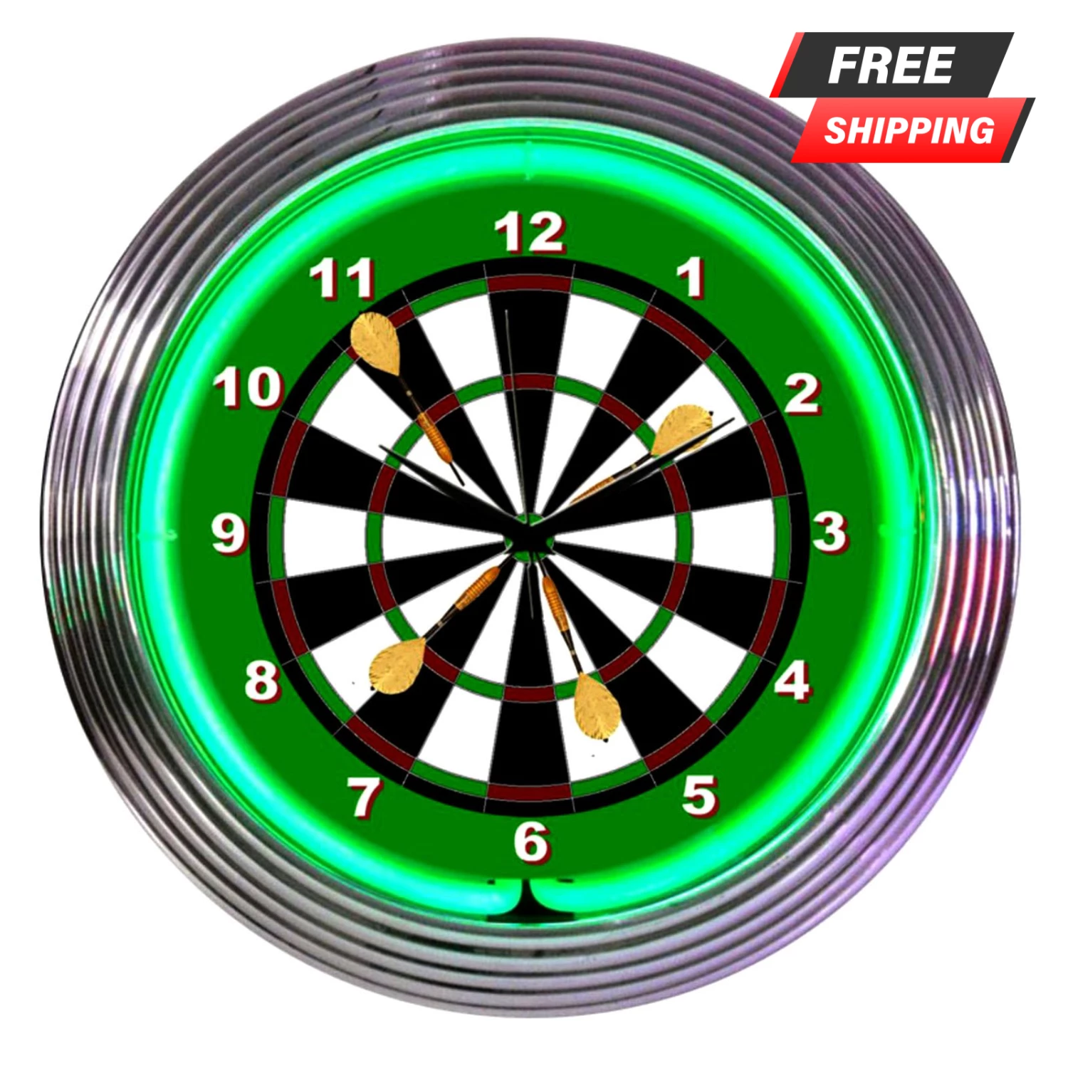 This Neon Clock generates 25 watts of light from a hand blown ring of real glass neon. Showcases a glow of real neon!! Features a glass face and a chrome rim with a single ring of green neon. The quartz movement clock operates on one AA battery (not included). The neon light is powered by an AC adapter (included) that plugs directly into a wall outlet. A great addition to any mancave. Indoor Use Only