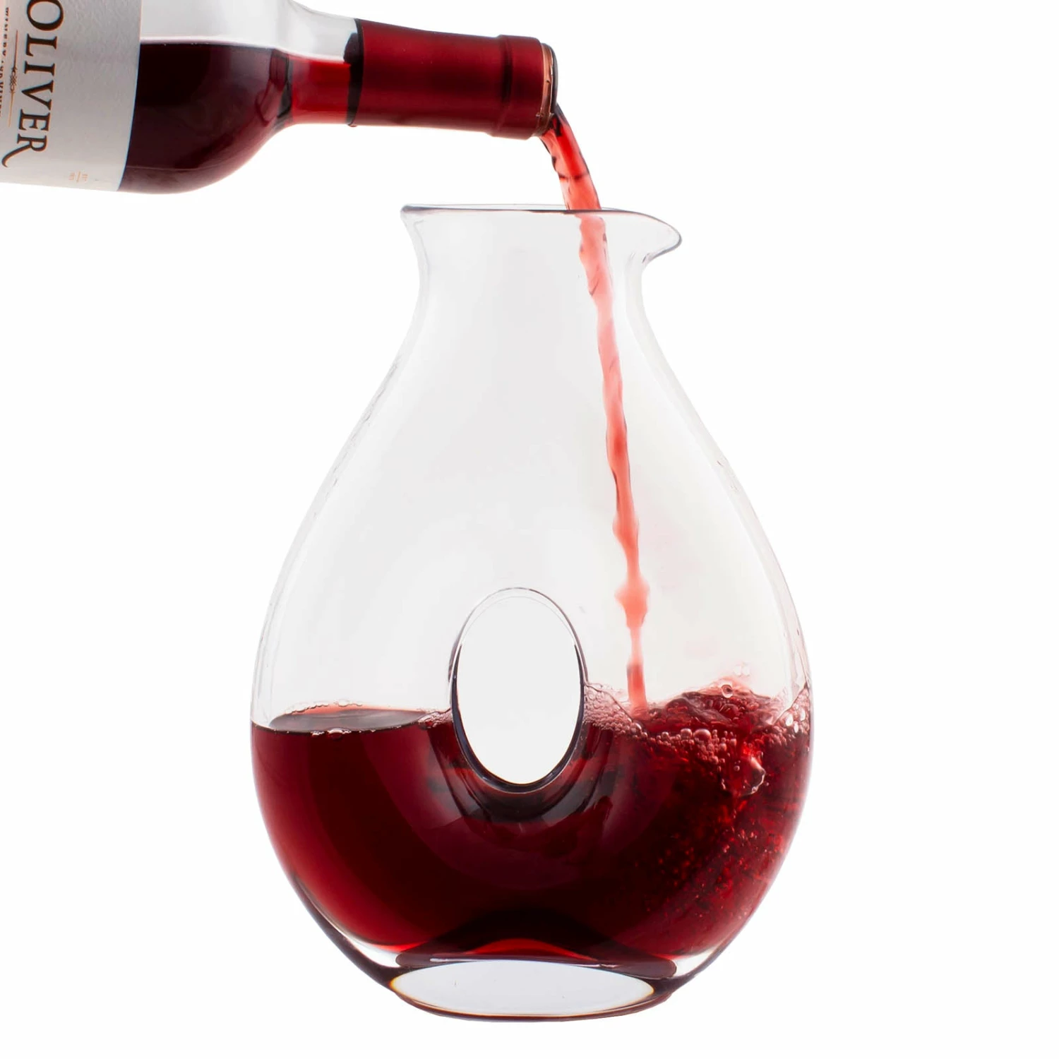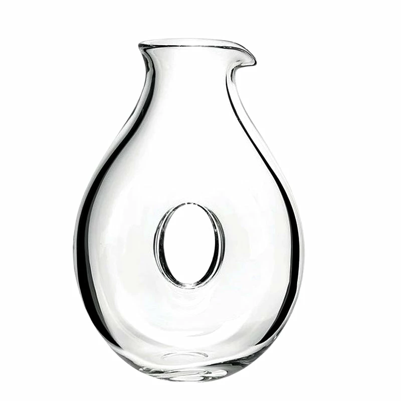 This stunning 34 oz. glass oval decanter with central pass through is truly amazing. Decanting is simply transferring the wine from the bottle to another container. When you pour in and out of the glass decanter, the wine travels over specially designed curves, maximizing the scent and flavor of your favorite wine. The circular design aerates the wine more efficiently, as it pours through both sides of the “doughnut,” allowing the flavors to develop more fully. At home it affords a great way to increase enjoyment of a wine after it has been decanted. Measures 9 1/2″ H x 6 3/4″ W