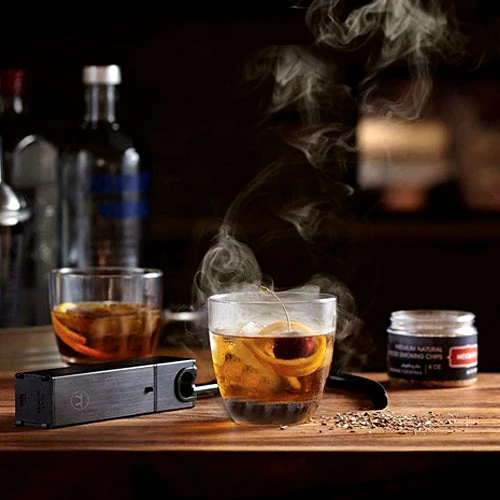With this Portable Infusion Smoker you are minutes away from eating delicious smoked food just grab it, light the wood chips, teas and spices, even hay, dried flowers and herbs to infuse a variety of natural smoky flavors to an array of food and drinks, cheese and cocktails This ingenious mini smoker is an alternative to traditional smoking methods. When you use our flavor filled wood chips, you get unique distinct flavors that are subtly released. With this cool smoker you will be able to effortlessly infuse your drinks with a natural smoky flavor. This new way of smoking is gentle enough for fruits, veggies, simple syrups, salts, ice and other garnishes, imparting a delicate flavor without changing the texture or temperature. Since all of the heat is contained in the smoking chamber, the smoke that is released is cool and gentle. A great way to infuse the spirit itself before using it as a component ingredient in a finished cocktail is by way of a sealed decanter. The smoky aromas emitted from this flavor infuser are perfect with bourbon, Bloody Mary’s and Manhattans. Customers or guests will love watching the swirling smoke and savoring the amazing results from this sleek portable infusion smoker. Add style and complexity to your favorite cocktails using authentic different wood smoking chips. Measures 1.5” H x 1.5” W x 9” D