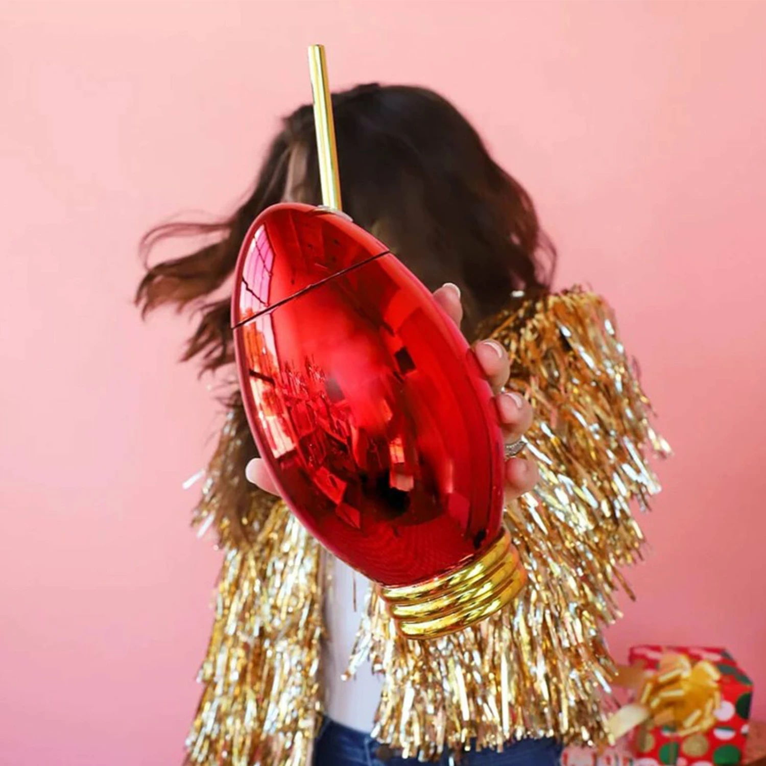 Red Shiny & Bright Holiday Light Cup with lid and straw. This fun 24 oz cup is ready to take on any holiday party or winter event. Simply twist the lid off and pour whatever your favorite holiday beverage is in and get to drinking! Perfectly designed to give a nod to your favorite nostalgic Christmas light. The cap screws on tight and features a 0.25″ diameter straw hole on the top with spill-proof stopper. The plastic straw measures 8 ⅛ ” length. The cup as well as the straw is reusable. Measures 8” H x 4” W.
