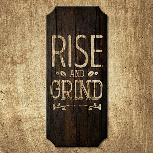 The Rise and Grind wood plaque coffee shop sign inspires you to get up and start you day off right with a hot cup of joe, iced latte or any other delicious cafe beverage! It can be hung at home in your coffee nook or up in a cafe, coffee shop or espresso bar to inspire patrons with a good morning.