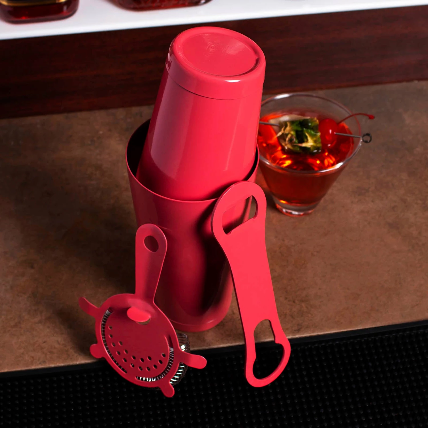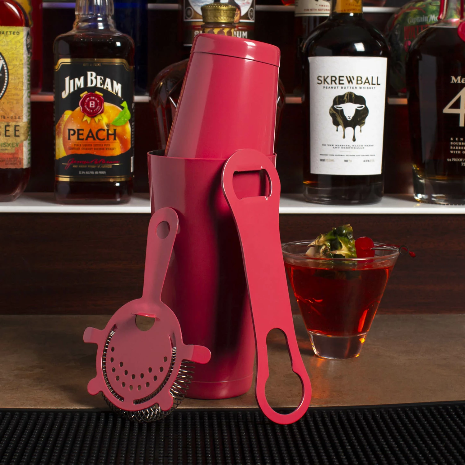 This 4 piece Rose Pink Bar Set is equipped with everything you need when making cocktails your guests. It includes a 28 ounce and 18 ounce shaker tin, a 4 prong strainer, and a V-Rod® opener. Not only can this set get you started, but it also makes the perfect gift for your bartending friends. It is made of durable stainless steel and has a bright reflective color making it stand out in your bar.