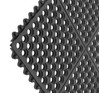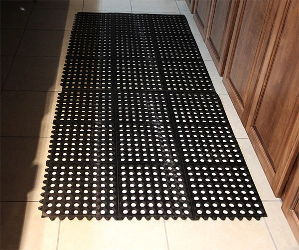This Interlocking Rubber Floor Mat is ideal for every type of working service environment from kitchens and bar, to warehouse and utility work stations. It’s low, half inch profile and slip resistant surface help with both employee comfort and safety.