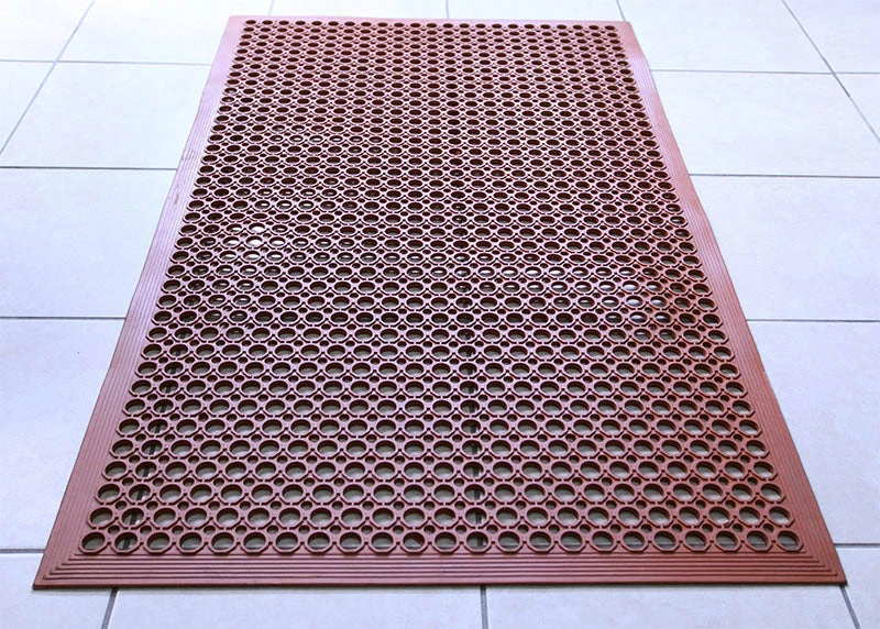 These rubber floor mats are great for wet or dry use in bars, restaurants, work areas, kitchens, cafeterias and more. Place these mats around dish washing areas and under ice bins where the floors tend to get slippery. Constructed from durable rubber, these mats offer your staff a safety element that is vital in your operations, as well as protecting yourself legally. The beveled mat edges will prevent tripping and increases accessibility for easy cart access. Dimensions: 5’L x 3’W by ¼” Thickness. 1 inch circular holes with raised rings to drain fluids and provide traction.