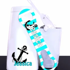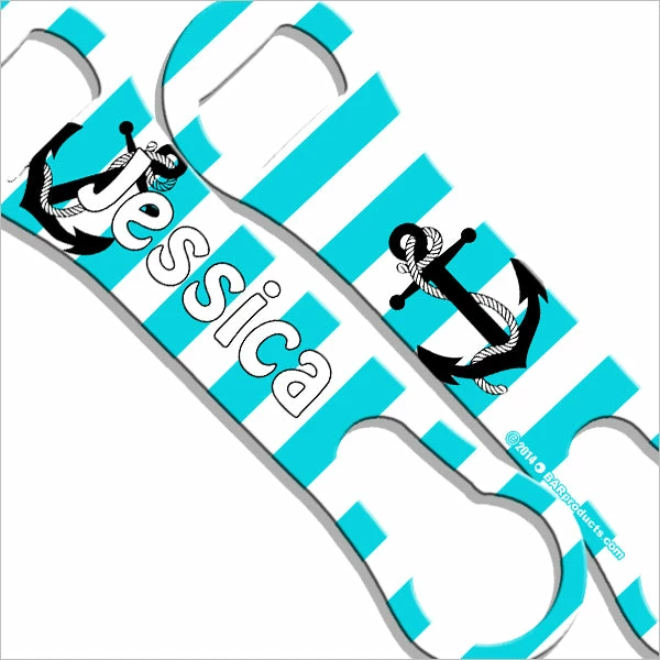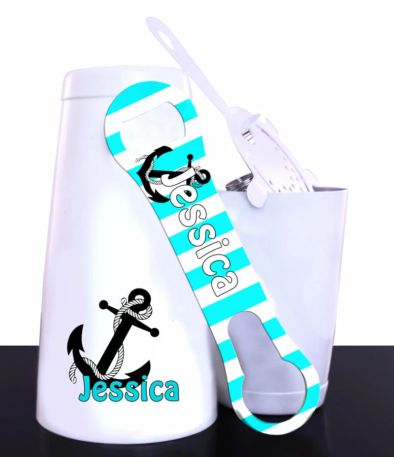 Come Sail Away with this one of a kind Bar Tool Set. This nautical design is the perfect canvas for some personalization. Place your name on this cocktail shaker set and you will have the perfect set for home or a conversation starter when creating drinks behind the bar.