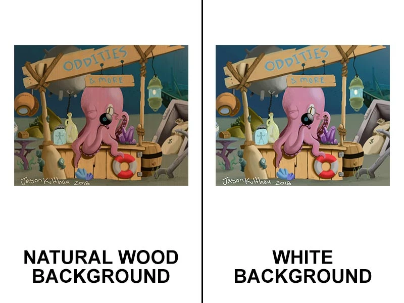Available in either a Natural Wood background or a White background. The texture of the wood shines in the Natural Wood option, while the whites from the art are more vivid with the White option.