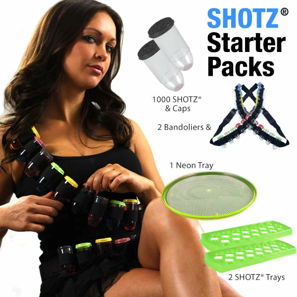The Starter Pack contains everything you need to get started with SHOTZ® Bullet Shot Cups. This set includes: 2 Bandoliers, 1000 SHOTZ® Bullet Shot Cups, 1000 Caps, 2 SHOTZ® Trays, and 1 Neon Serving Tray. Bar and club owners will love the increased amount of shot sales when servers and shot girls sell Bullet Shots.