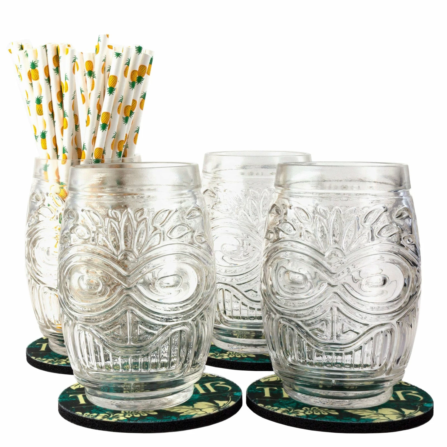 If you are looking for the perfect gift idea for your tiki loving friends or simply looking to add to your tiki collection, then this Squat Tiki set is a great option! This set includes 4 of our signature BarConic® “squat” style grinning face glasses. Each glass has deeply defined lines that interrupt the thick, quality glass creating an elegant glass design mold and is perfect for any cocktail service occasion. Also included in this kit is our custom screen printed tiki bar coasters and a 100 pack of our signature BarConic® eco-friendly pineapple paper straws.