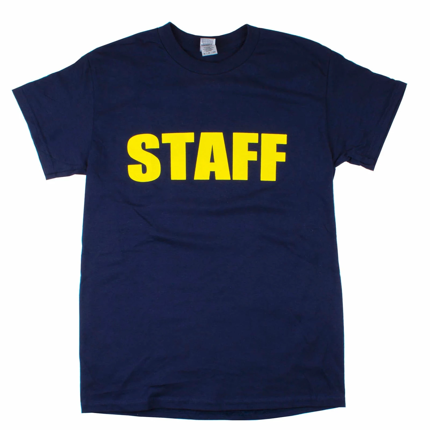 If you need your staff team to be easily spotted and identified during events, you must have them wearing the same style uniform, like these professional looking tees. These Navy Blue short sleeve t-shirts are screen printed with the word STAFF on the front and back in high contrast Yellow. These tees are made of preshrunk, 100% cotton for comfort and durability. Available in Small, Medium, Large, X-Large, and X-Large.