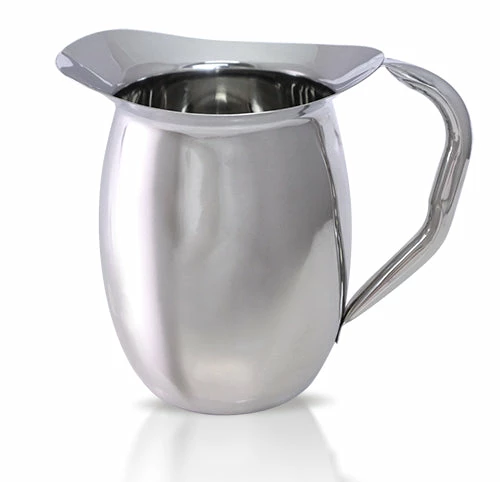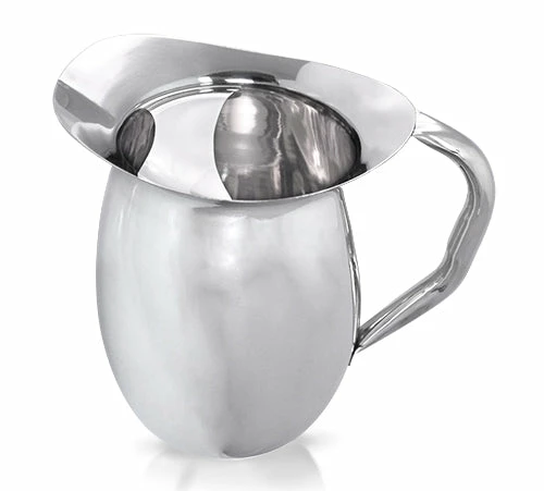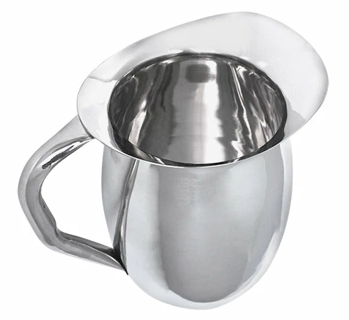 This 2 Qt. Bell Pitcher is constructed of beautiful 18/8 stainless steel and has a unique design featuring a large pouring lip, welded handle, and bell-shaped body. This pitcher is perfect for water, iced tea and other commonly ordered beverages. It can be placed out for customers at the self-service table at your coffee shop or bakery, or be carried by wait-staff for table side service.