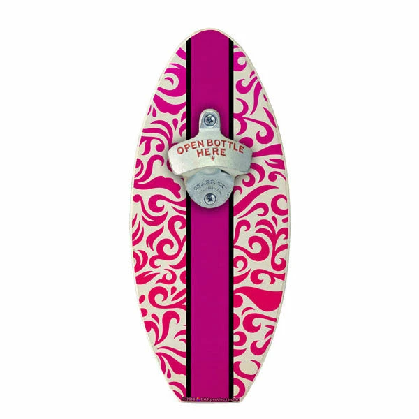 The Swirls Wooden Surfboard Wall Mounted Bottle Opener comes is 2 gnarly colors that will look great at any tiki bar! This bright and fun bottle opener is the perfect way to pop off bottle caps after a long day out on the surf. Boards have holes drilled in the top and bottom for easy mounting anywhere.
