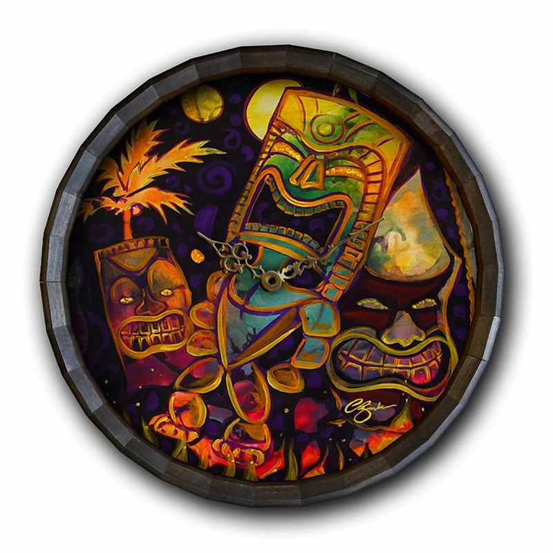 The Tiki Fire Night Wood Barrel Top Sign or Clock features the whimsical and fun art of CBjork. This exciting night time tiki bar scene features dark luau vibes that will look great hung anywhere! The art comes straight from painter CBjork, and even though it is a print, it looks like it was painted right on the Barrel Top!