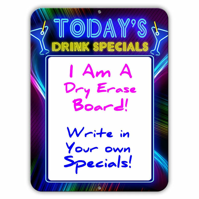 Looking for a cool, fun and cost-effective way to promote your drink specials? Check out these 12″‘ x 18″ or 9” x 12” metal bar signs that act as a dry erase board as well. Utilize the white center to write in your daily specials and anything else you would like to promote. Full color neon sign themed printing decorates one side using our popular Kolorcoat™ process. 4 pack of assorted color dry erase markers sold separately.