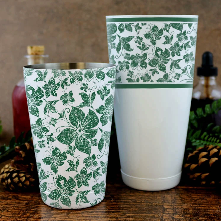 This grungy floral pattern shaker set is perfect for any type of bartender who likes to add a vintage element to their showmanship, and also makes for a great gift idea. Included is a standard stainless steel 28 ounce weighted shaker along with its counterpart, the 18 ounce weighted shaker. These tins fit beautifully together providing a tight seal for an excellent shaking environment. The stainless steel walls ignite the ice within, giving your liquid libations the ultimate chill.