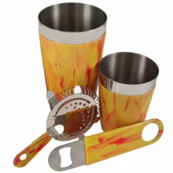 This VinylWorks™ bartending Set is covered in an exciting red and yellow vinyl coating that gives you better grip while working behind the bar. The weighted shakers fit with each other perfectly allowing you to mix together drink ingredients without making a mess. The stainless steel construction of this 4 piece bartending set makes sure that it will withstand the test of time. The 4-pronged strainer in this set is great at making sure nothing but the cocktail is dispensed. The double sided bottle opener in this set is designed for speed and efficiency, it makes opening any bottle a breeze. This is a great bartending set for any nightclub or bar.