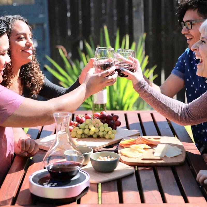 This is the next essential restaurant (or home) appliance! The Wake Up Wine Electronic Decanter Set with Bluetooth 3D Speakers. Enhance the aromas and improve the flavors of wine in a convenient, fast and fun way. Decant wine in just minutes, not hours, and make it taste 2-5 times better. Easy touch control panel you set or adjust decanting time with the push of a button. No need to guess how long you should decant your wine. Simply use the Recommended Decanting Times Guide for optimizing any wine by varietal as well as spirits such as whiskey, scotch, rum, tequila, cognac, brandy, vodka and gin. The 750 ML decanter is dishwasher safe and made of recycled glass. It’s a great conversation piece making it a beautiful addition to any kitchen, bar or table. Regulate your pour using measuring marks at 4, 6, and 8 oz. Conveniently take this set everywhere from indoors to outdoors without having to connect to a power outlet. The battery is estimated to last up to 4 hours of continuous use from a full charge. The Bluetooth 3D speakers can stream music from any connected smartphone or tablet to set the tone of the party, or help you relax while enjoying your wine. Dual 2” stereo speakers with dual passive radiators ensure crisp vocals, extended bass response, and 360° omni-directional sound.