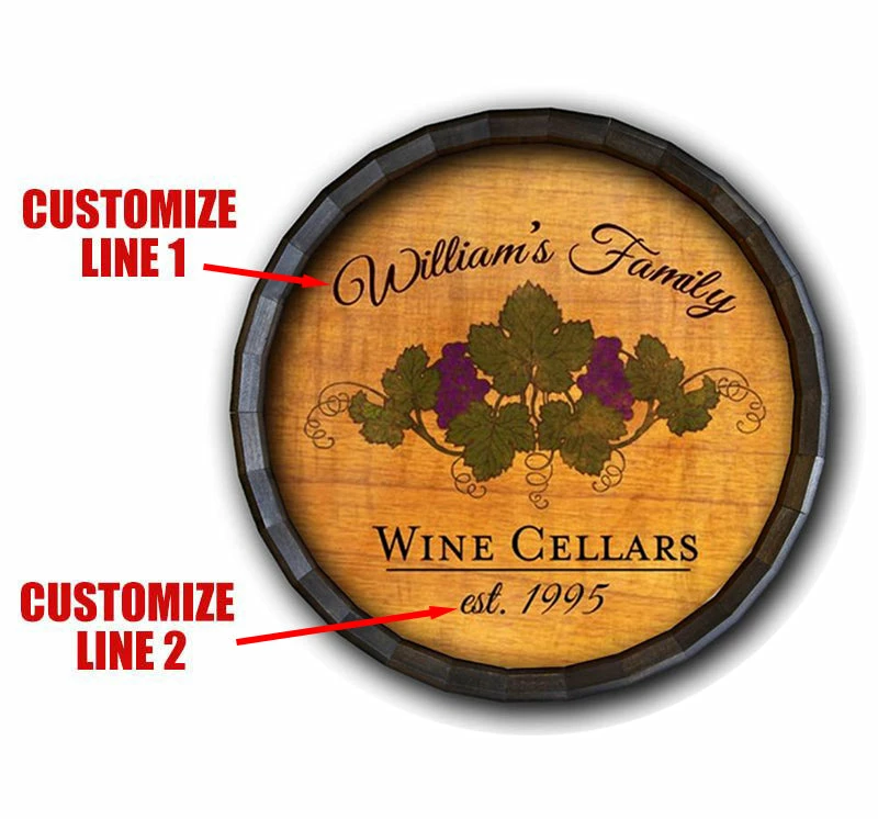 Customize this Wine Cellar themed Barrel Top Tavern Sign with your family name and chosen year of establishment. This hand made sign makes a great gift and will look good in any room. It is especially perfect for wine lovers. Each barrel sign is hand crafted by skilled artisans, and assembled in the BarProducts.com Wood Shop. It is especially perfect for rum lovers. Plus, the best part is…adding your personalized information is no additional cost to you!